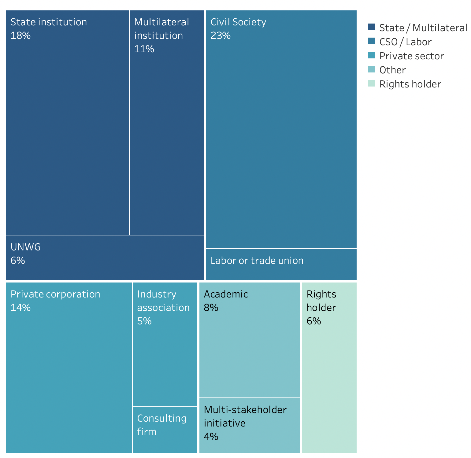 If a speaker appeared on multiple panels during one UN Forum convening, that speaker was recorded each time, because each panel represents a separate speaking opportunity. I did not include moderators in my calculations, for the reasons that Tara Van Ho states, namely, that a speakers' role “is to provide expertise, nuance, and clarity about specific issues and to substantively respond to the audience's questions,” whereas a moderator mainly directs the flow of the presentation. Also borrowing from Van Ho’s approach, the speaker categories were assigned based on the capacity in which the person was speaking. For example, although the UN Working Group on Business and Human Rights (UNWG) has included several academics, they were designated as “UNWG” if they were speaking in that capacity. Similarly, rights holder speakers are those from affected communities, speaking on the issues impacting them.